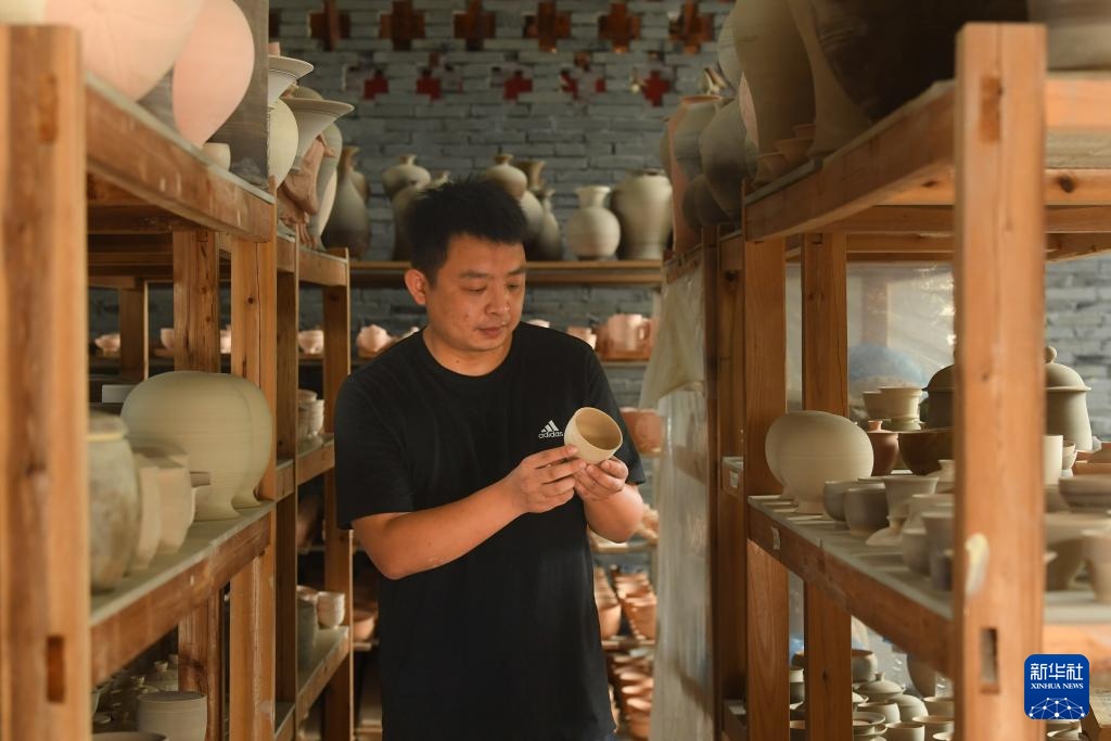7月11日,谢振威在窑房整理素坯。