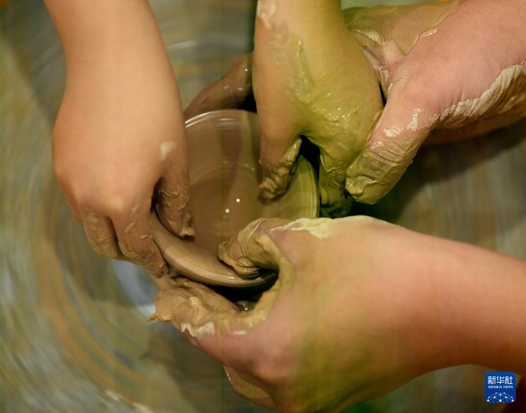 7月11日,谢振威在工作室教前来研学的小学生拉坯。
