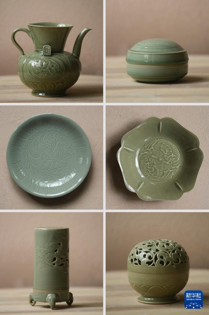 这张拼版照片展示的是谢振威烧制的青瓷作品(7月11日摄)。