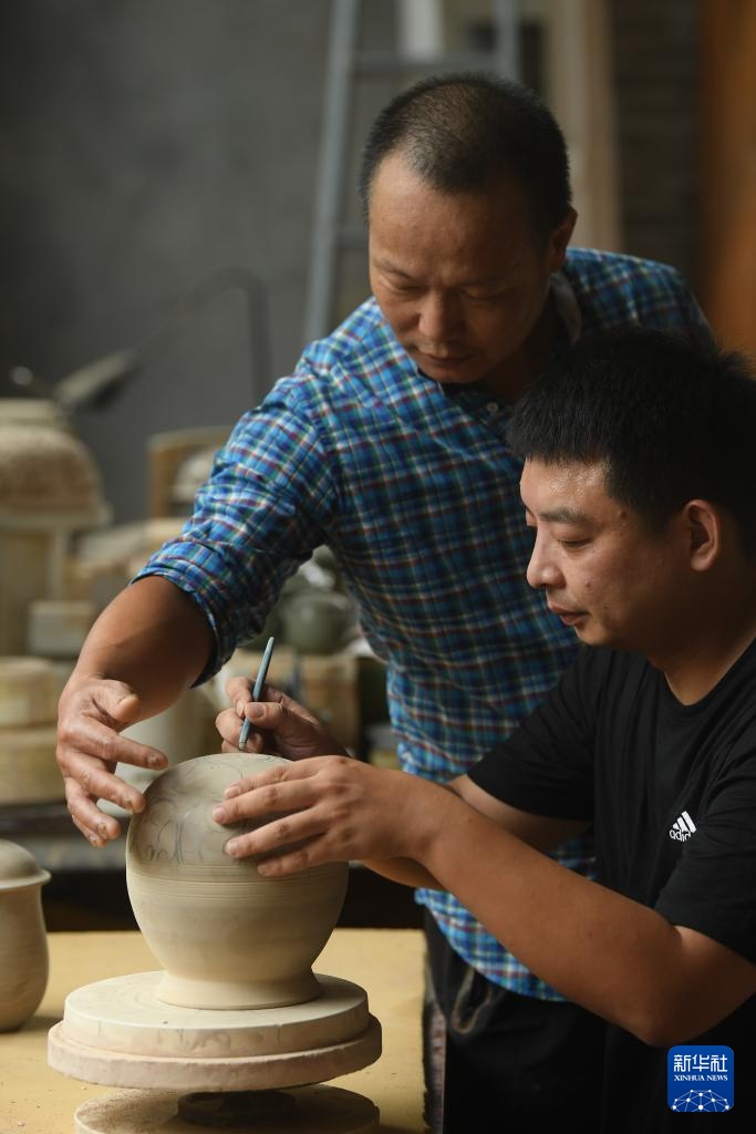 7月11日,龙泉青瓷艺人陈均林(上)在指导谢振威镂空一个沙埠窑特色的香炉。