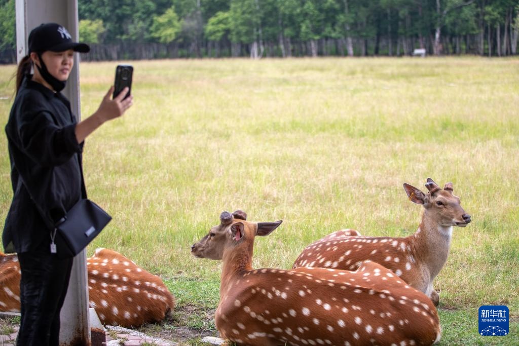 7月11日,在伊春市上甘岭溪水国家森林公园鹿溪牧场内,一名游客给鹿喂食。
