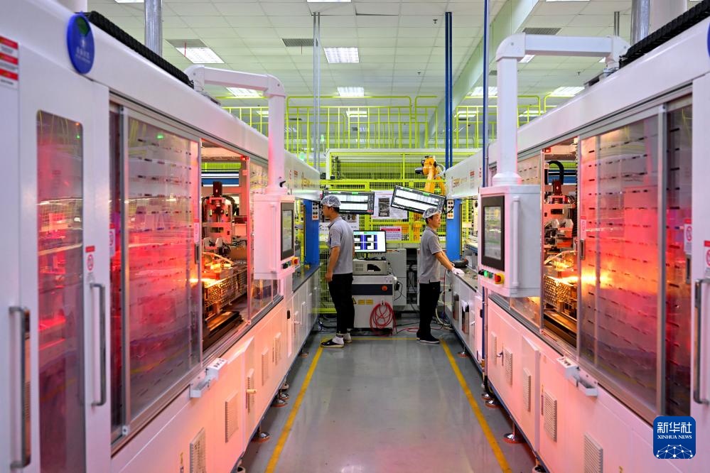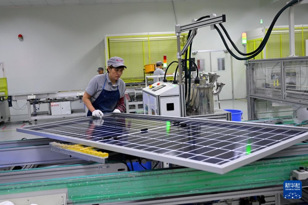 7月12日,在颍上县一家光伏组件生产企业,工作人员在车间内忙碌。