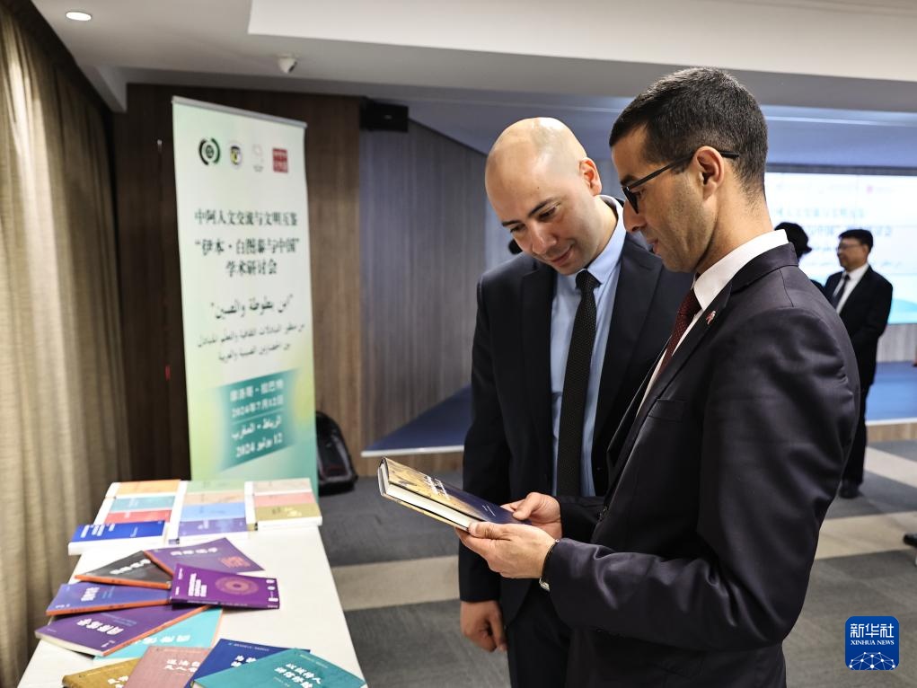 7月12日,在摩洛哥首都拉巴特举行的“伊本·白图泰与中国”学术研讨会上,摩洛哥学者查看阿文版图书。