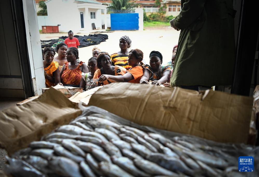 7月8日,在几内亚比绍首都比绍,当地居民和水产品经销商在中企投建的水产品加工存储综合设施内购买水产。