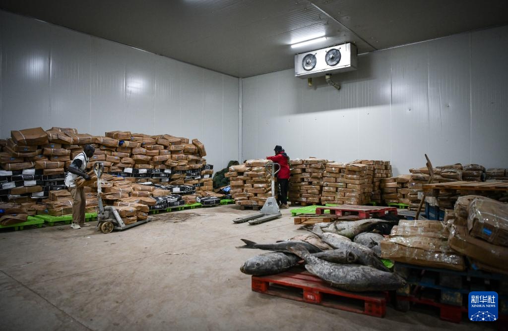 7月8日,在几内亚比绍首都比绍,工人在中企投建的水产品加工存储综合设施冷库内工作。