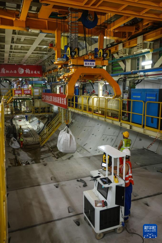 7月13日,施工人员在“鲲鹏号”盾构机内吊运物资。