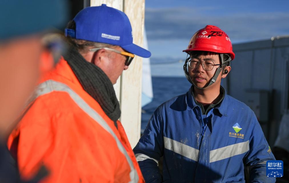 7月12日,钻探队员曾邦祐(右)在协助外国钻探技术指导与钻探队进行沟通。