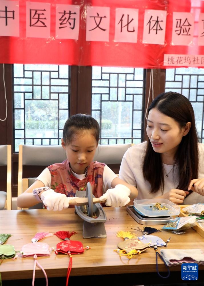 7月13日,在江苏省苏州市姑苏区桃花坞社区卫生服务站,小朋友在家长陪伴下制作香囊。