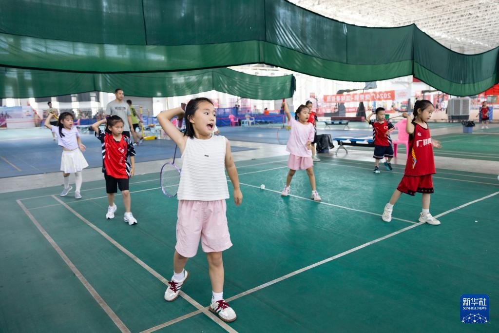 7月13日,孩子们在山东省东营市广饶县的一处培训中心练习羽毛球的基本技术动作。