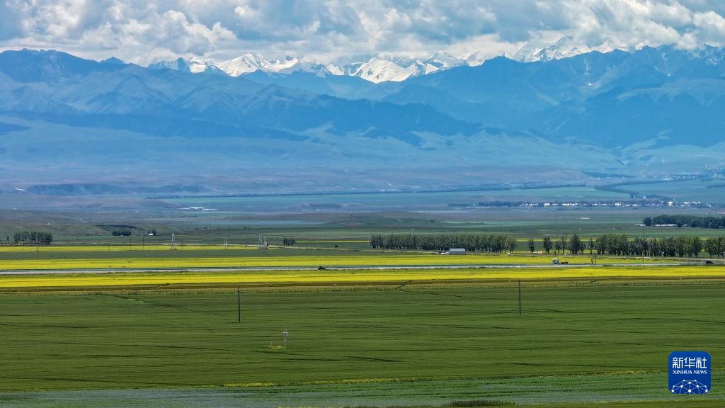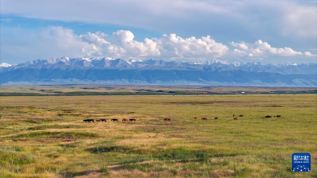 这是7月12日在新疆昭苏拍摄的草原和雪山(无人机照片)。