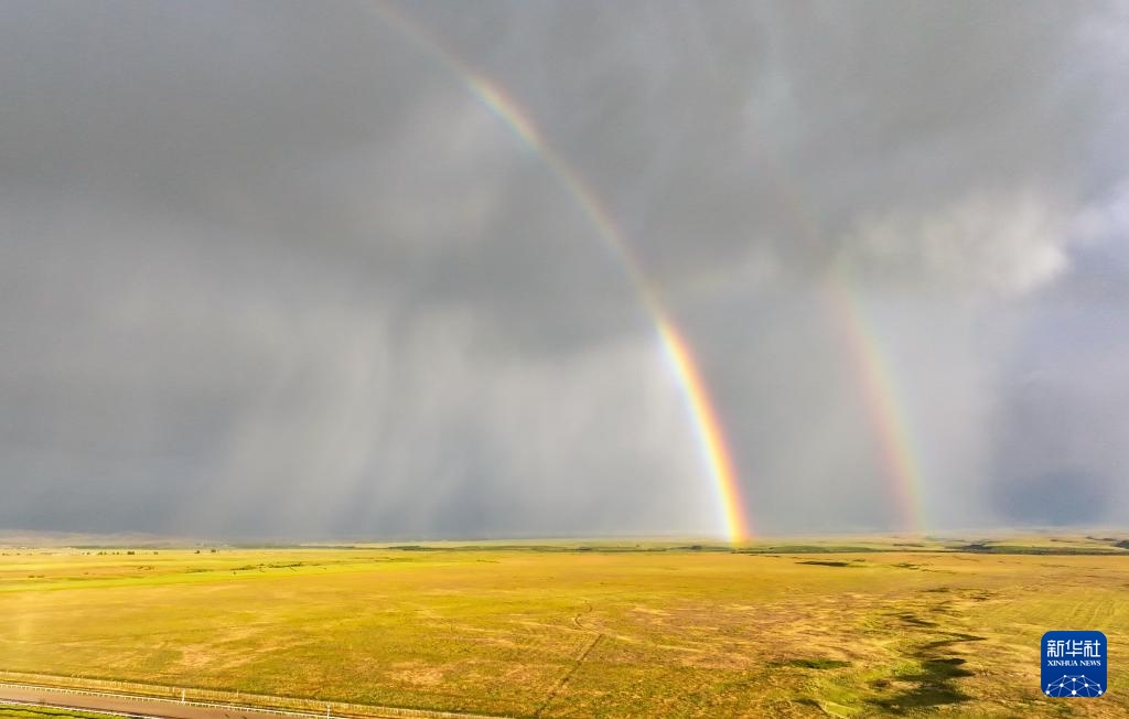 这是7月12日在新疆昭苏拍摄的雨后彩虹(无人机照片)。
