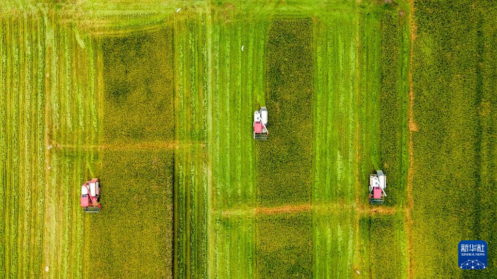 7月13日,在湖南省常宁市胜桥镇尹桥村,农民驾驶农机在收割早稻(无人机照片)。