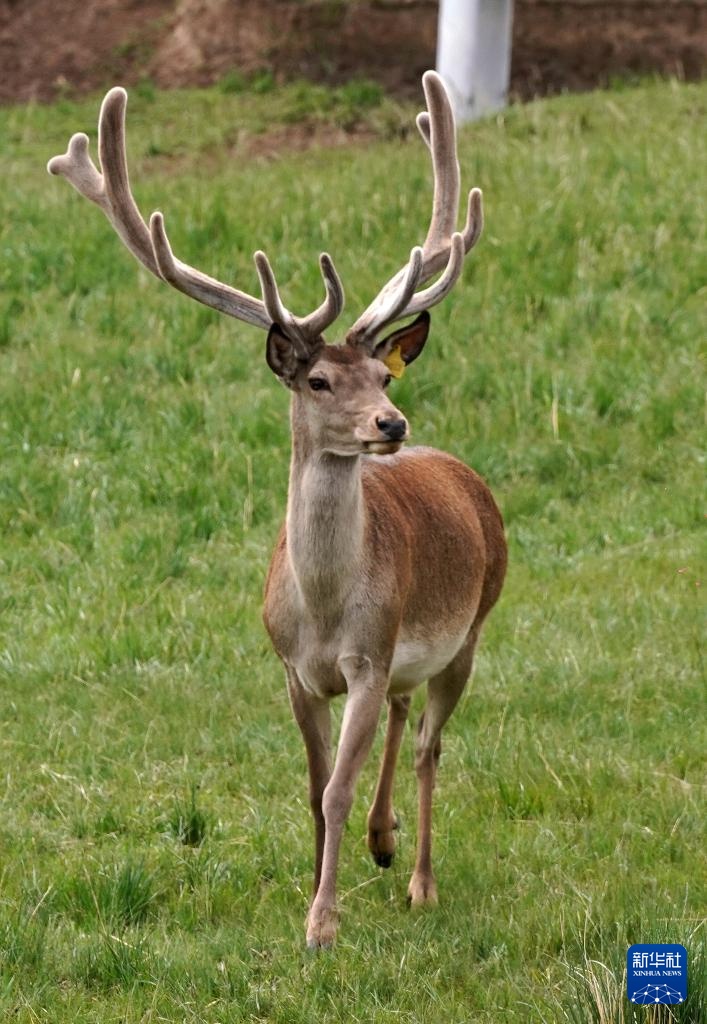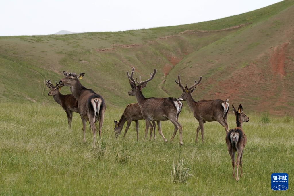 7月13日,在肃南县神鹿公园,马鹿在草原上觅食。