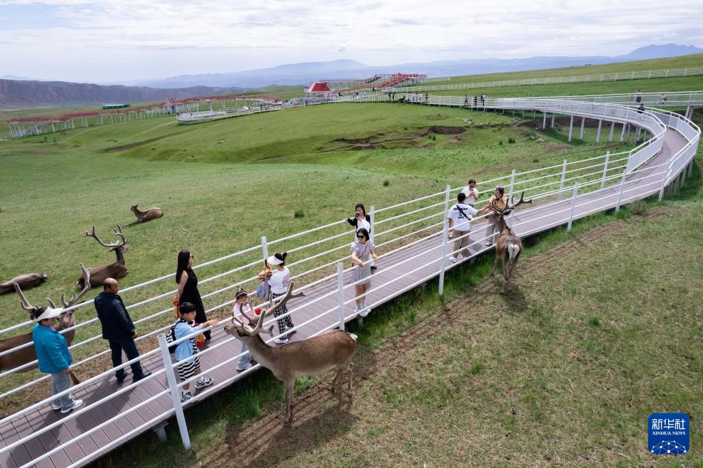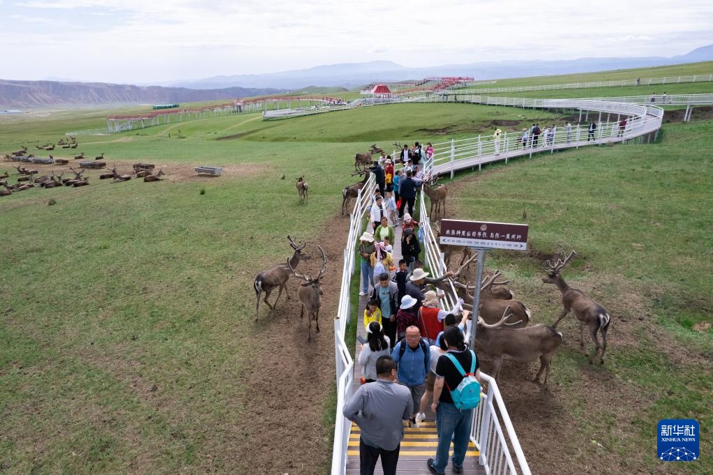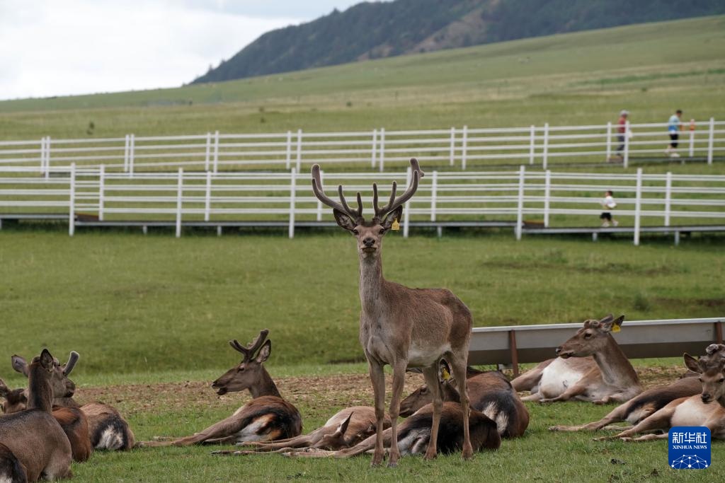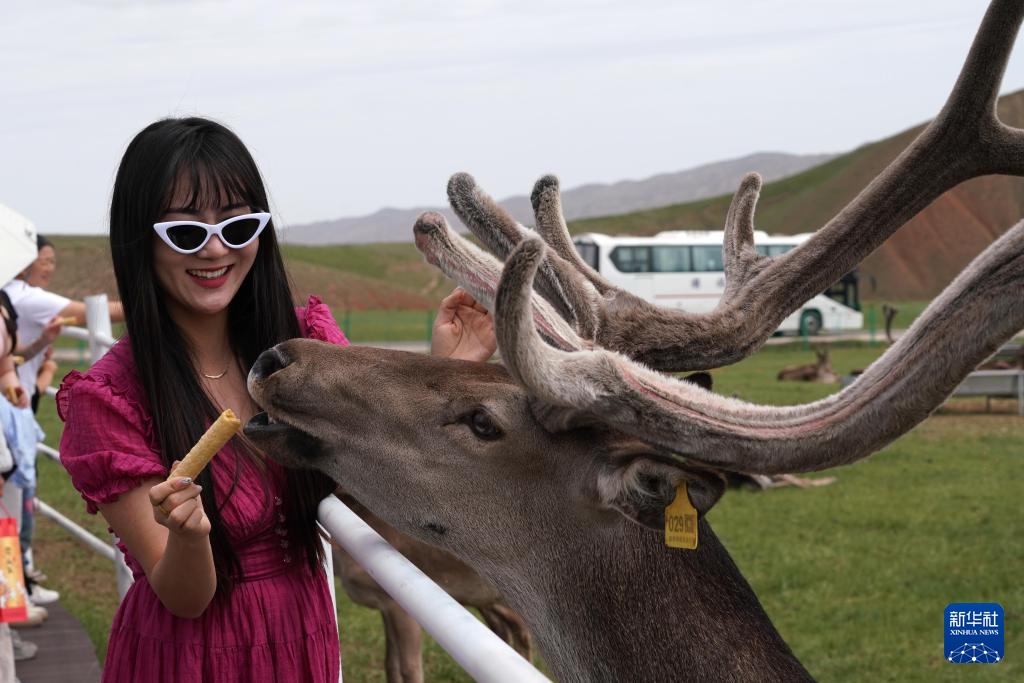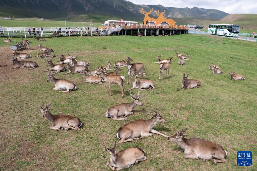 夏日里,在位于祁连山脚下的甘肃省张掖市肃南裕固族自治县神鹿公园,600多头马鹿在草原上休憩觅食,游客可以近距离观看马鹿并与其互动。