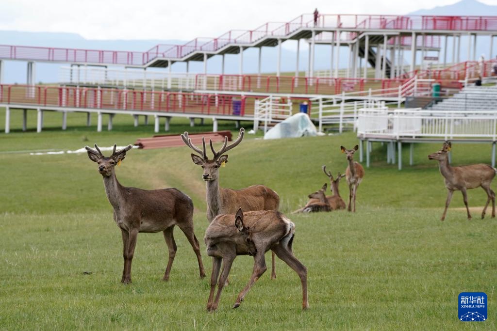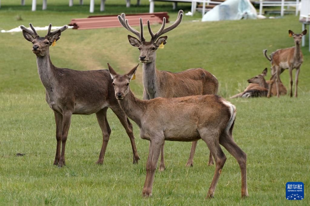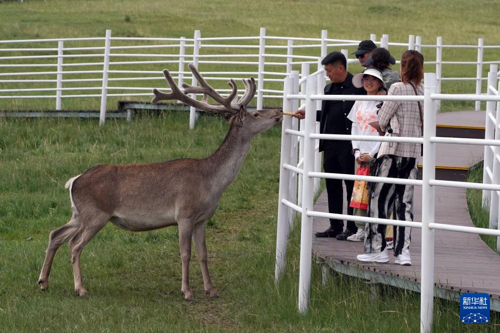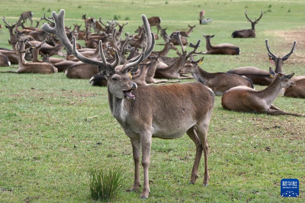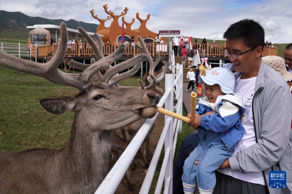 夏日里,在位于祁连山脚下的甘肃省张掖市肃南裕固族自治县神鹿公园,600多头马鹿在草原上休憩觅食,游客可以近距离观看马鹿并与其互动。