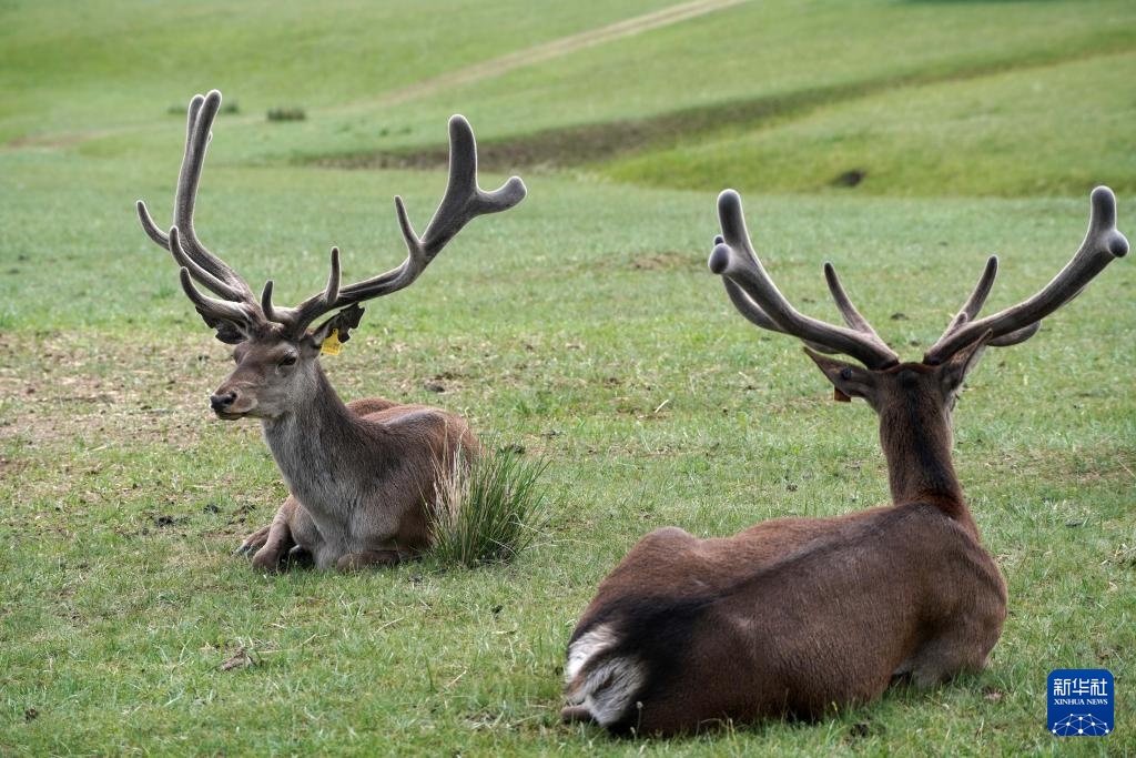 7月13日,在肃南县神鹿公园,马鹿在草原上休息。