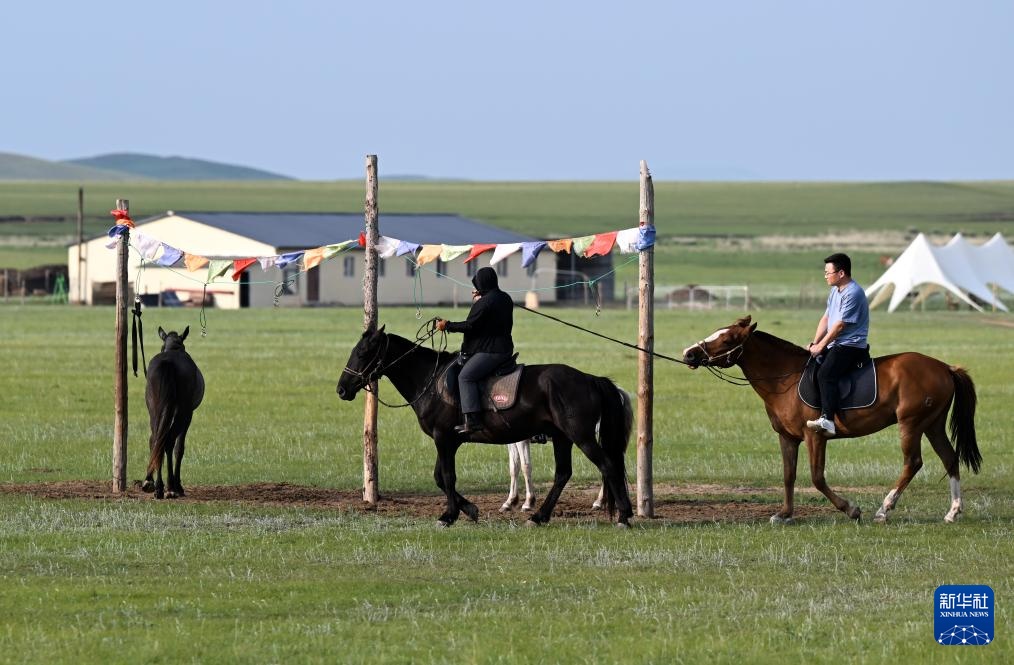 7月13日,游客(右)在锡林郭勒盟白音锡勒牧场上骑马。