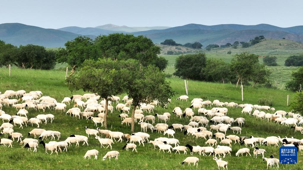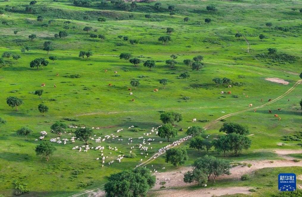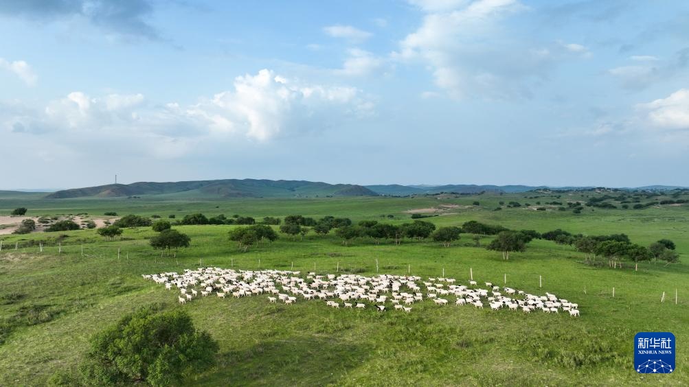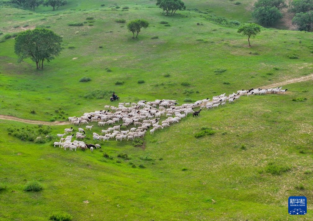 7月13日拍摄的锡林郭勒盟白音锡勒牧场上的羊群(无人机照片)。