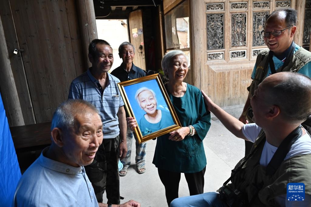 7月13日,在周宁县李墩镇楼坪村,一位拿到肖像照的老人现场向敬老摄影志愿者表示感谢。