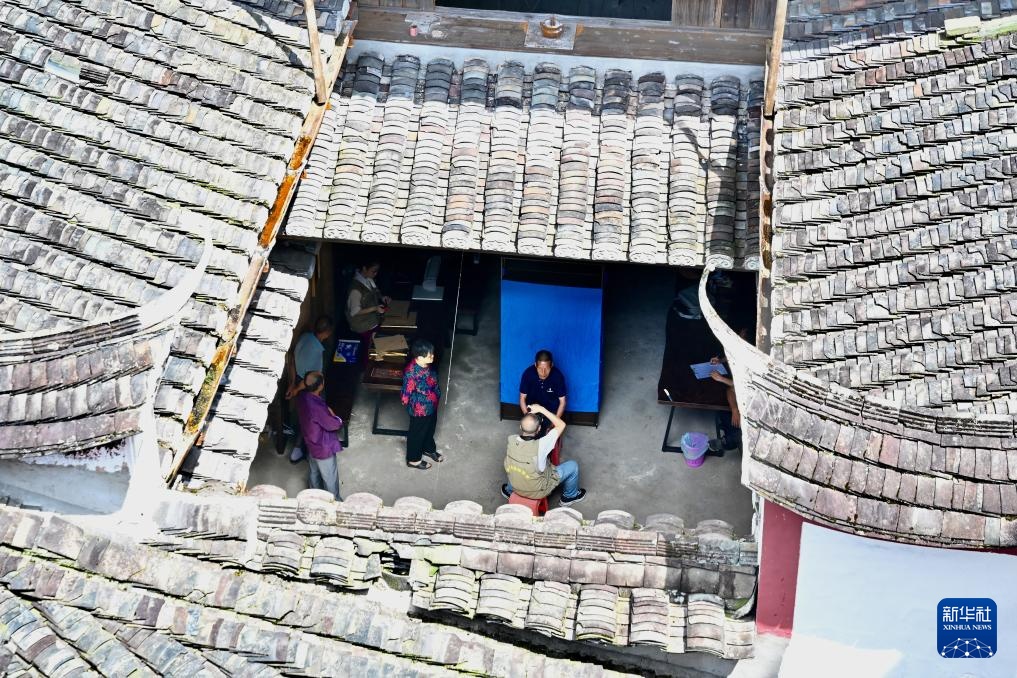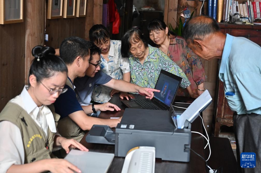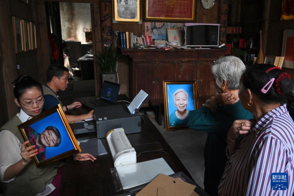 7月13日,在周宁县李墩镇楼坪村,敬老摄影志愿者(左)现场把拍摄的肖像照打印、塑封、装框,一旁老人在观看自己的照片。