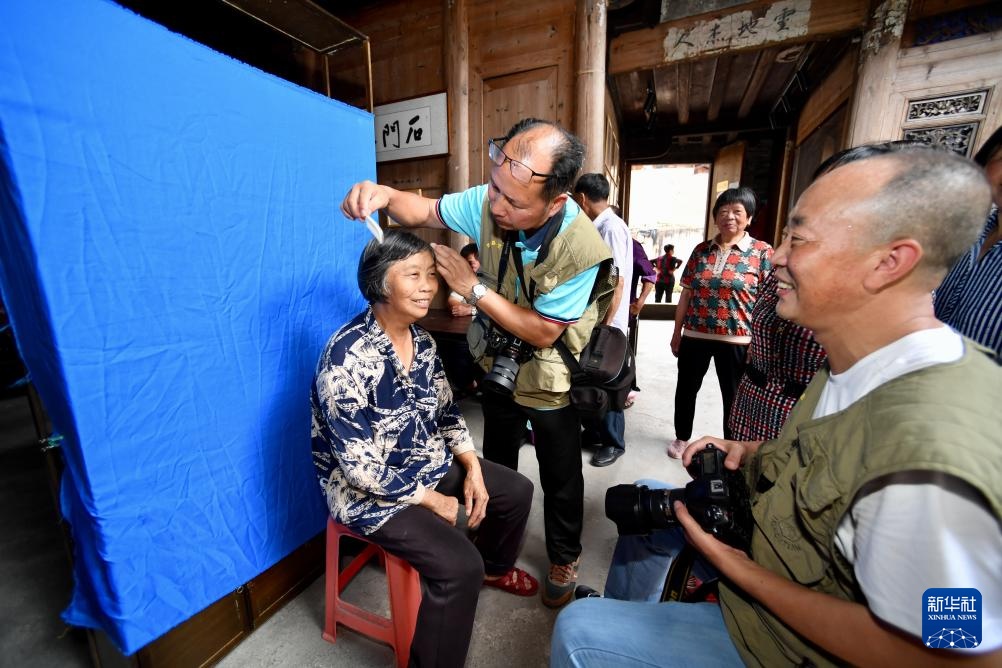 7月13日,在李墩镇楼坪村,周宁县敬老摄影志愿者为老人拍摄肖像照做准备。