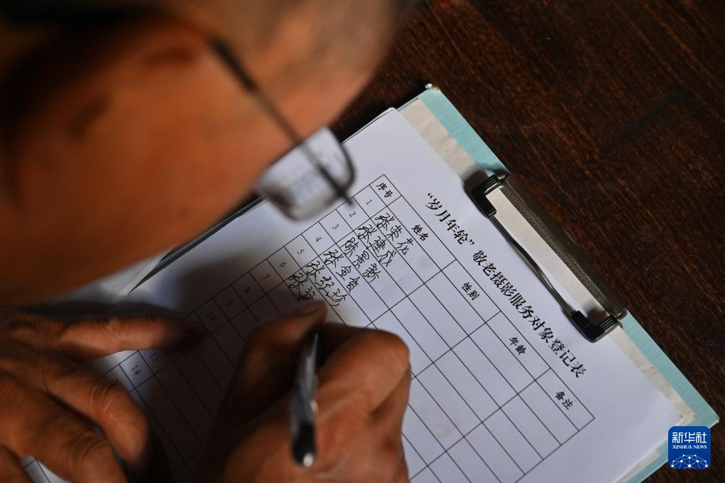 7月13日,周宁县李墩镇楼坪村一位村干部在为拍摄肖像照的老人做登记。