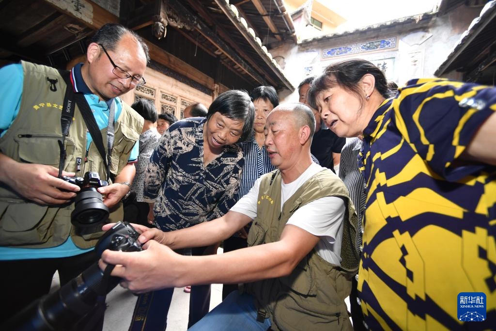 7月13日,在周宁县李墩镇楼坪村,村民围在敬老摄影志愿者周围观看图片制作过程。