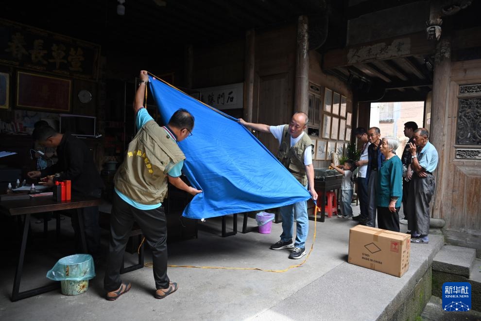 7月13日,周宁县敬老摄影志愿者在李墩镇楼坪村一老屋内布置肖像摄影背景布。