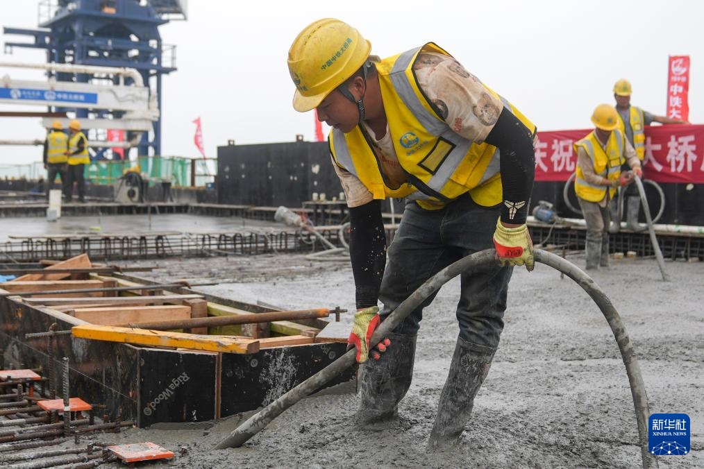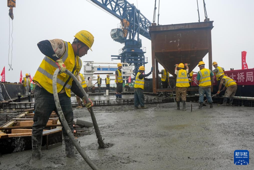 7月14日,工人在燕矶长江大桥主塔施工现场进行混凝土浇筑作业。