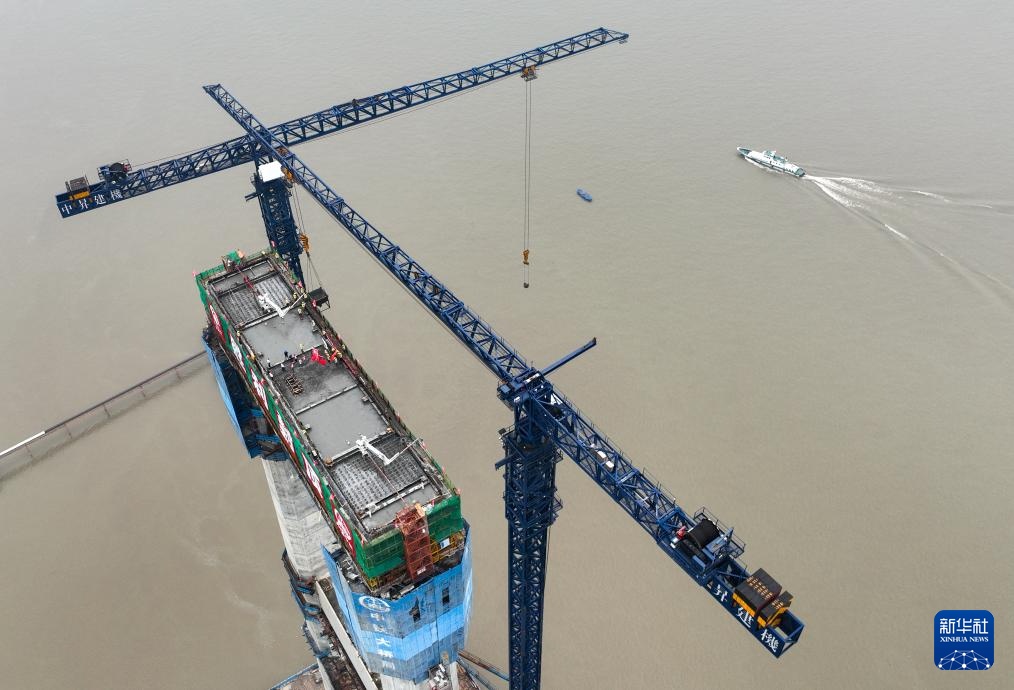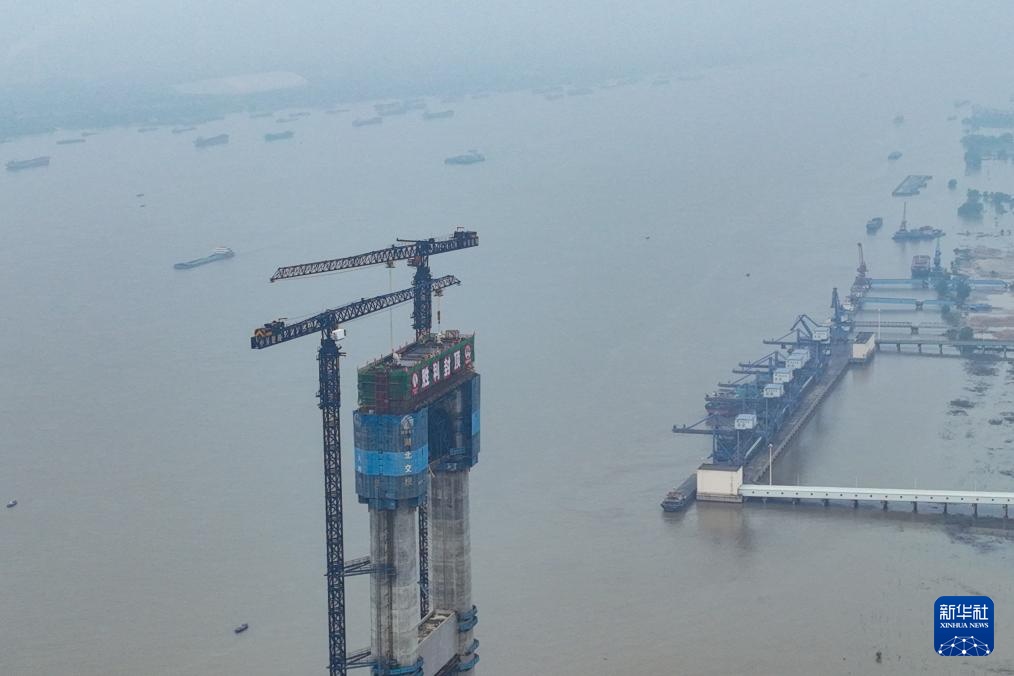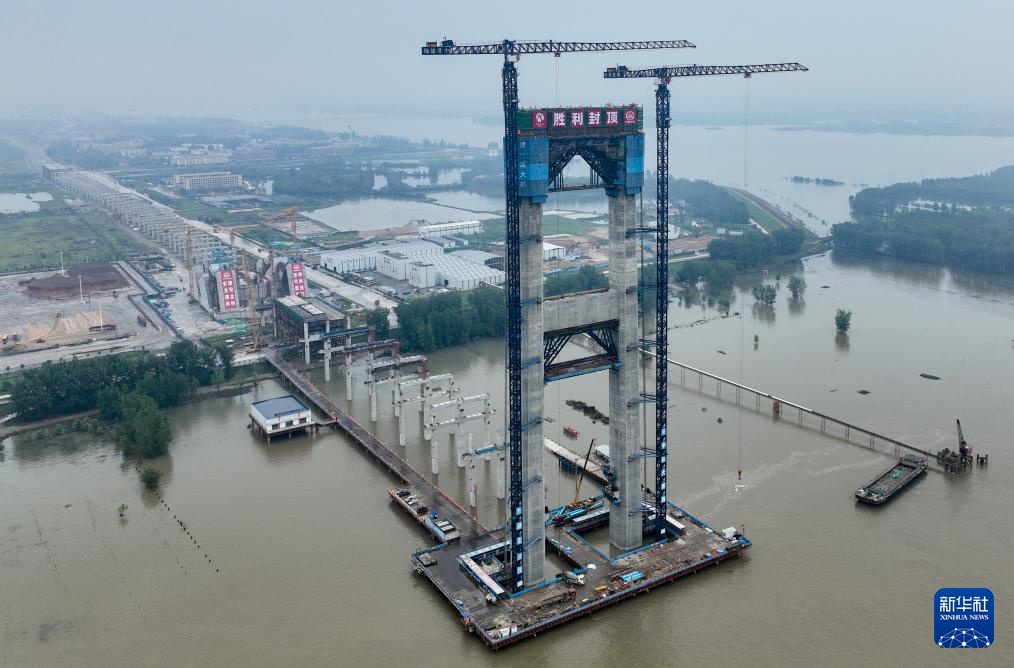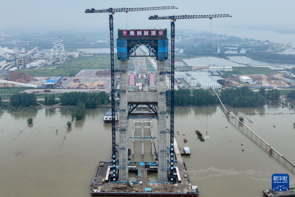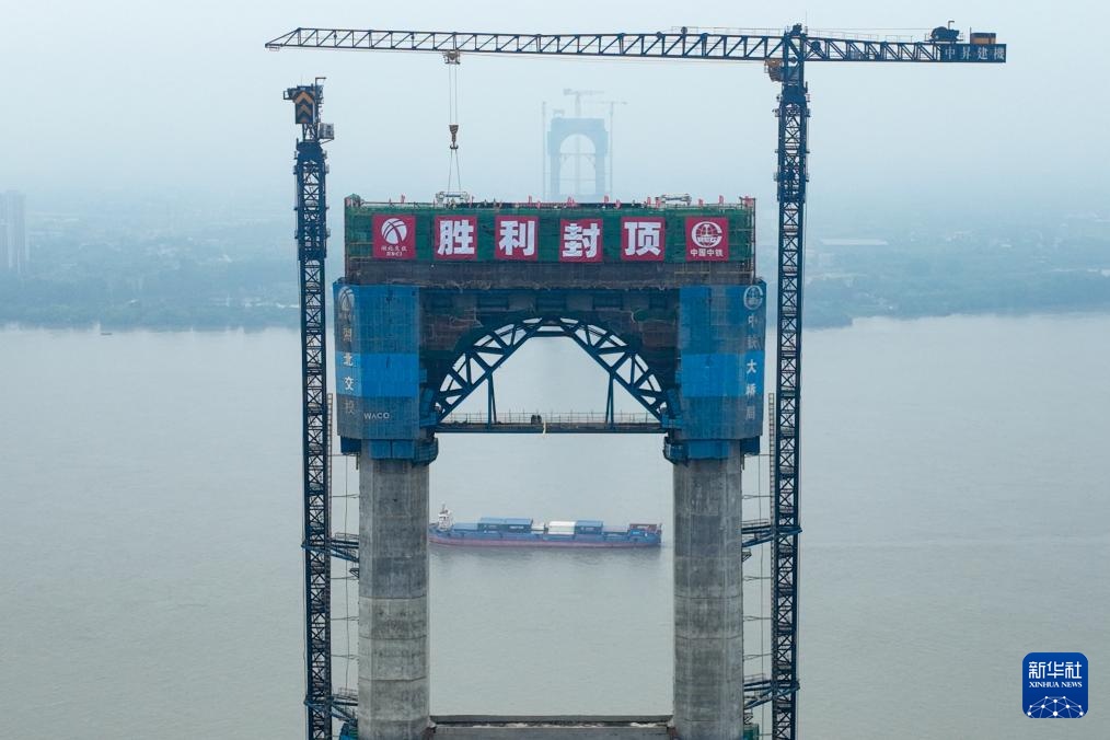 7月14日拍摄的燕矶长江大桥主塔施工现场(无人机照片)。