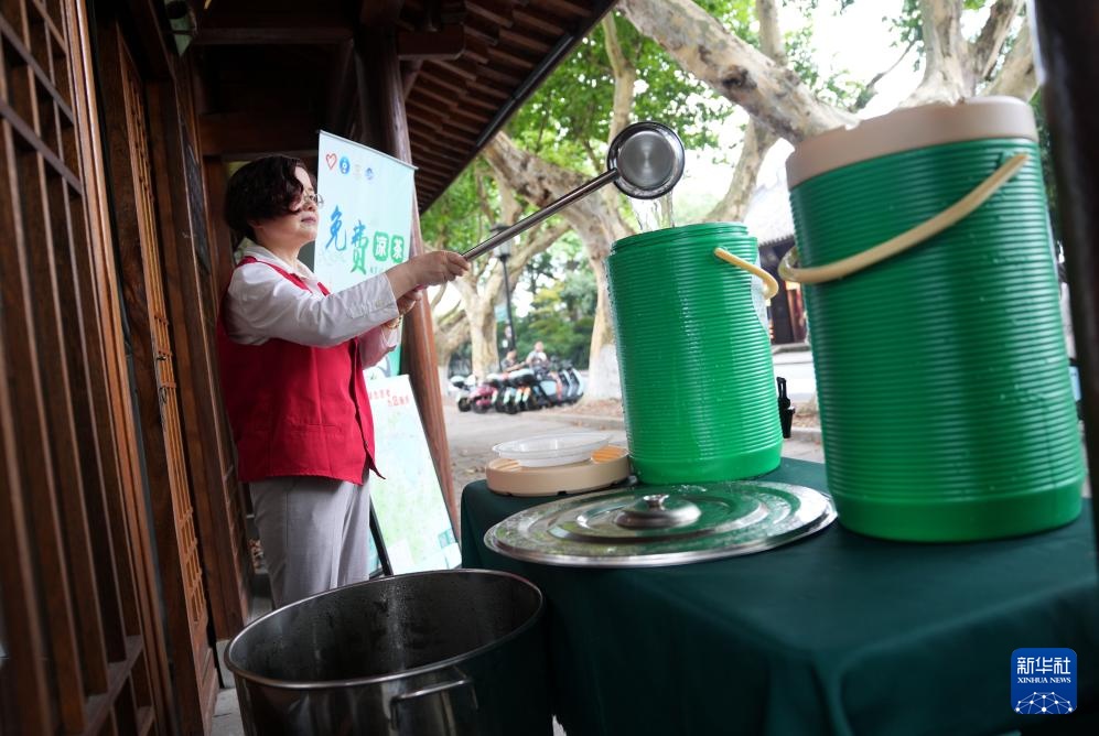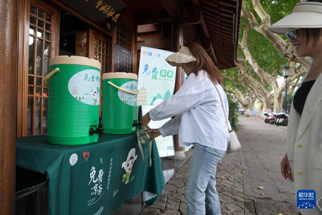 近日,杭州西湖景区沿湖的“西子驿·平湖秋月”等13个点位开始供应免费凉茶,在炎炎夏日中为市民游客送去清凉。