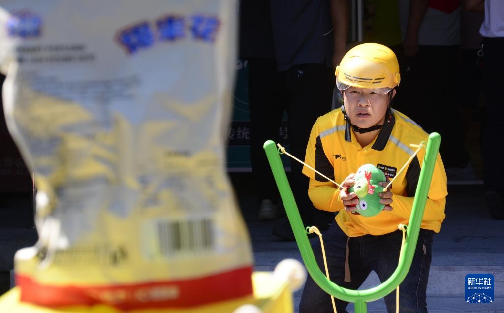 7月17日,一位外卖员在美食节上参加互动游戏。