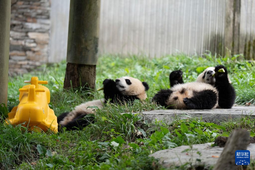 7月19日,在中国大熊猫保护研究中心卧龙神树坪基地,两只大熊猫幼崽躺着吃竹子。