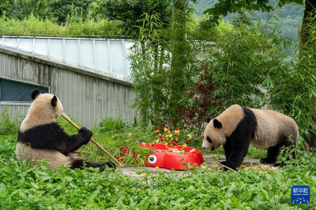 7月19日,在中国大熊猫保护研究中心卧龙神树坪基地,大熊猫“白吉”(左)和“胜兰”(右)在品尝美食。