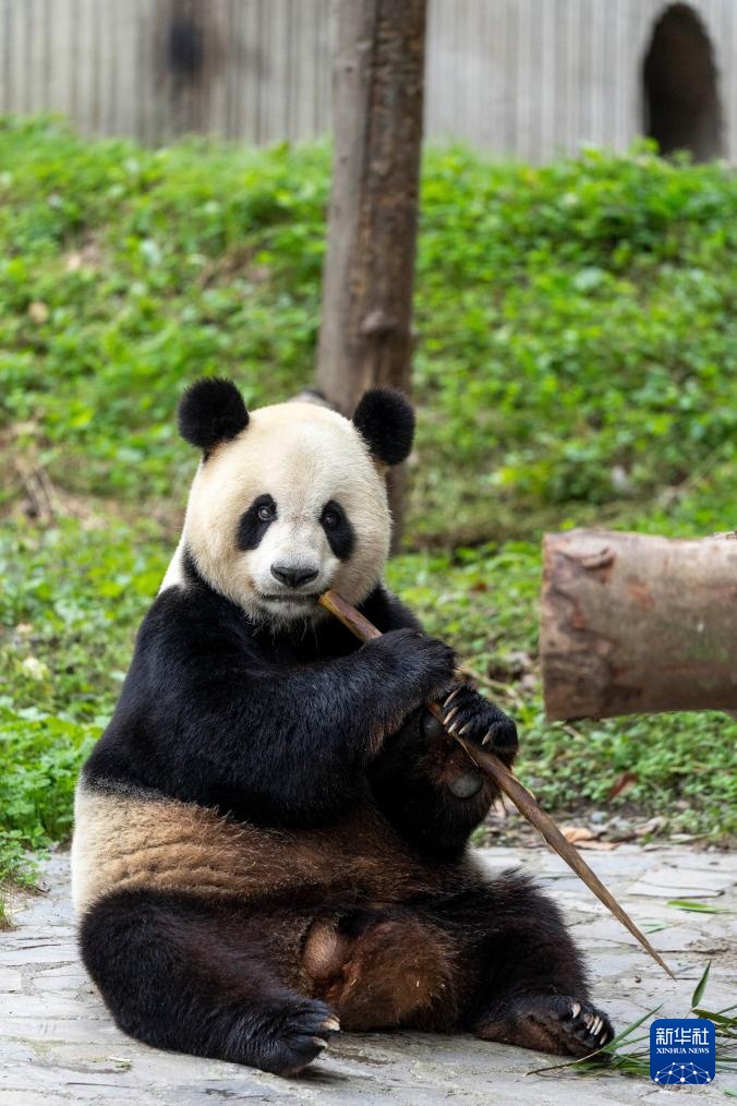7月19日,在中国大熊猫保护研究中心卧龙神树坪基地,大熊猫“福宝”坐在地上吃竹笋。