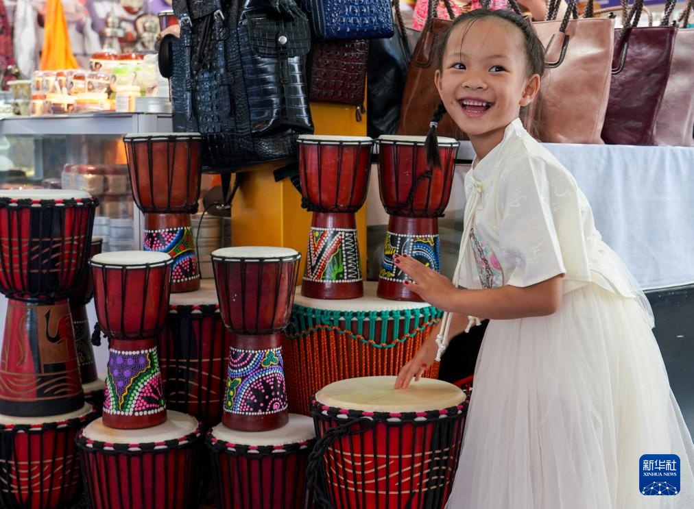 7月23日,小朋友在加纳展区体验非洲手鼓。