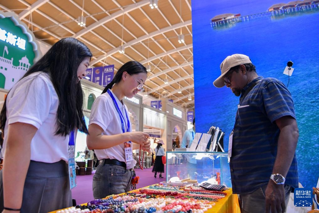 7月23日,两名女士在第八届中国—南亚博览会南亚馆挑选特色商品。