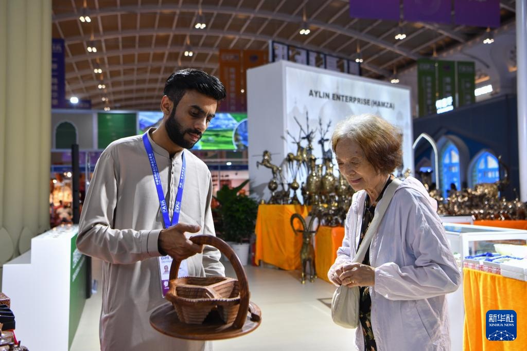 7月23日,巴基斯坦展区的展商向一名顾客推介特色商品。