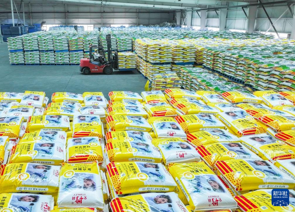 7月23日,工人操作叉车在河北省隆化县一家化肥企业仓库装车(无人机照片)。
