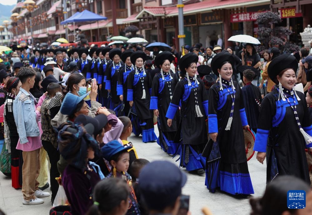 7月22日,在传统火把节银饰、服饰展演活动中,当地群众身着彝族传统服饰走在布拖县城大街上。