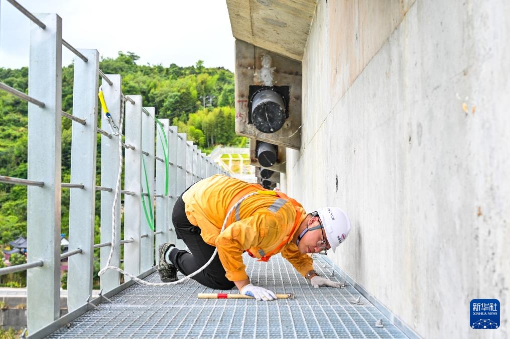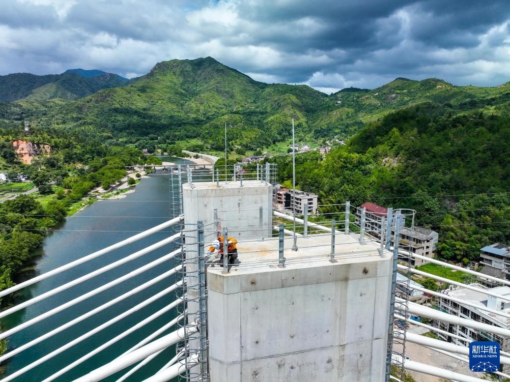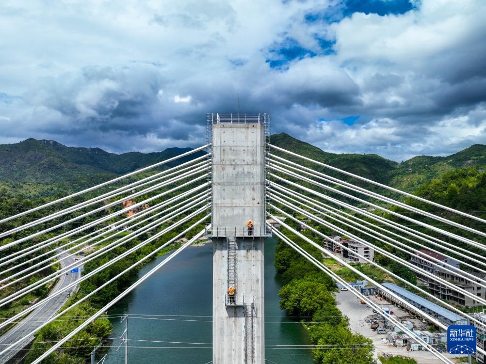 7月24日,宁波工务段防洪检查小组的铁路工人对杭温高铁楠溪江大桥主塔进行巡检(无人机照片)。
