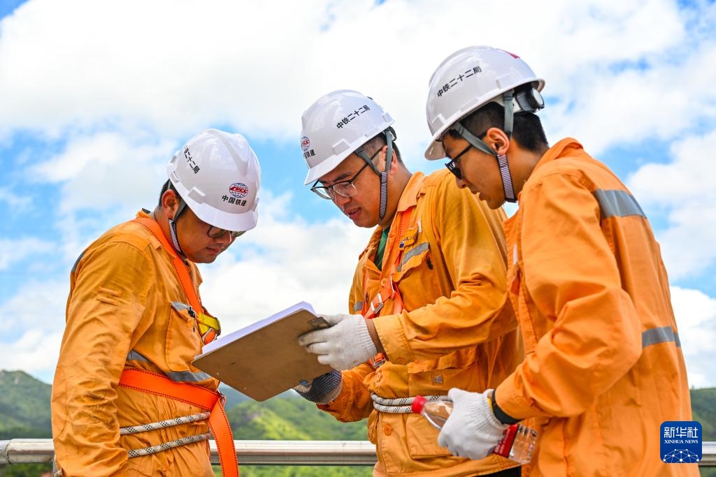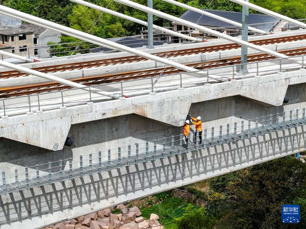 7月24日,宁波工务段防洪检查小组的铁路工人对杭温高铁楠溪江大桥进行巡检。