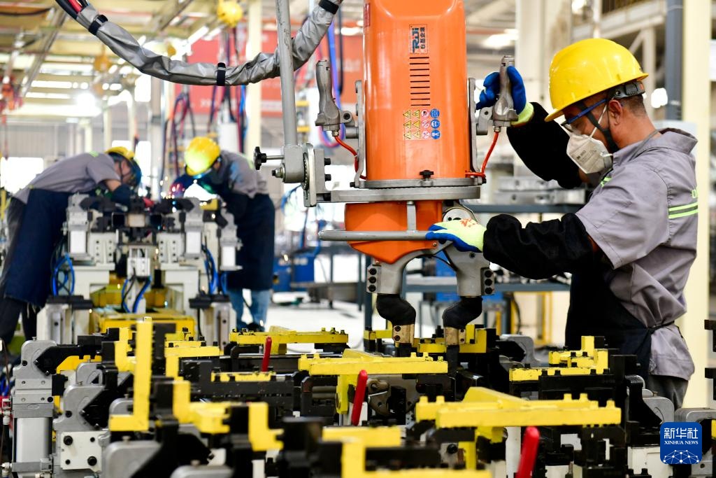 7月24日,在山东永利新能源车业有限公司,工作人员在流水线上焊接高尔夫球车车架。