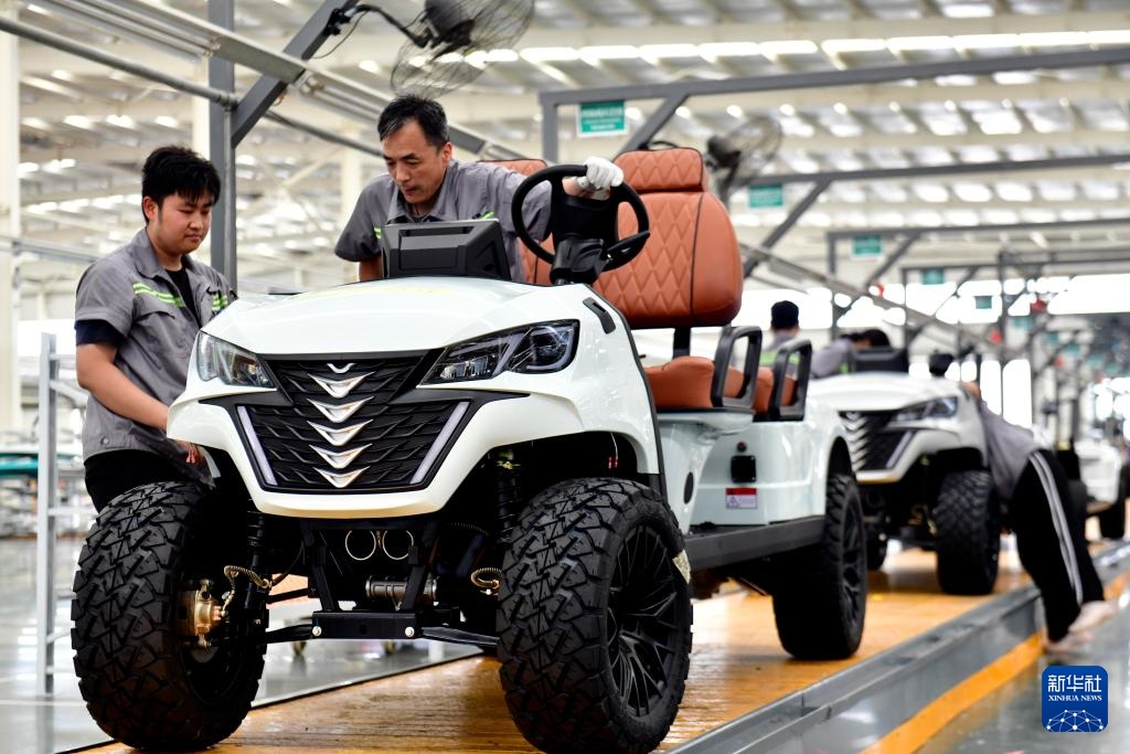 7月24日,在山东永利新能源车业有限公司,工作人员在流水线上生产高尔夫球车。