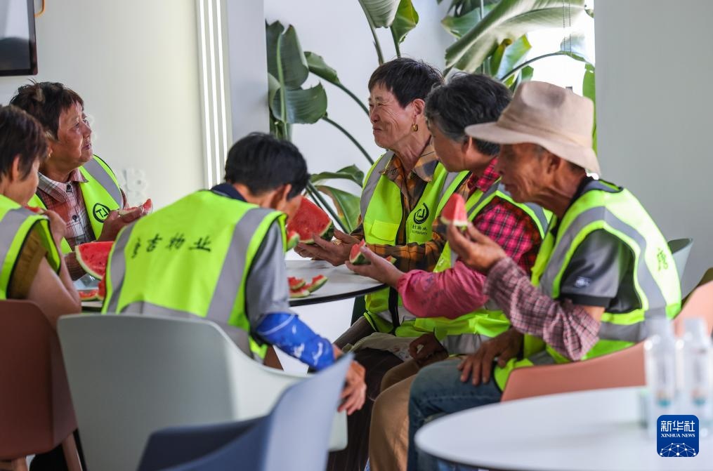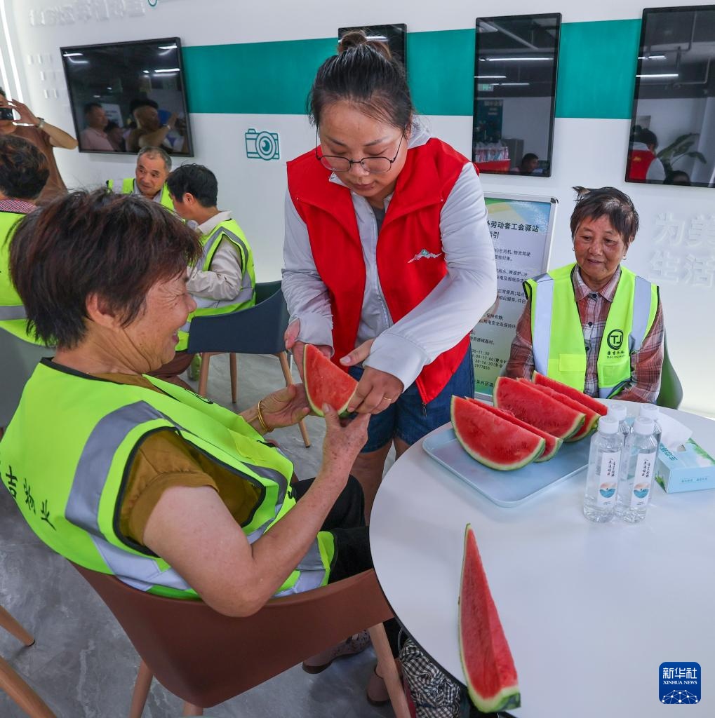 7月24日,户外劳动者在湖山府社区工会驿站休息、品尝解暑水果。