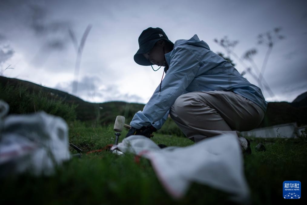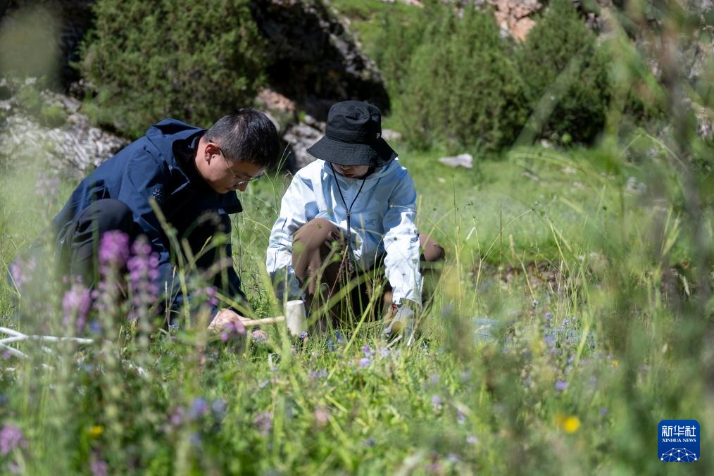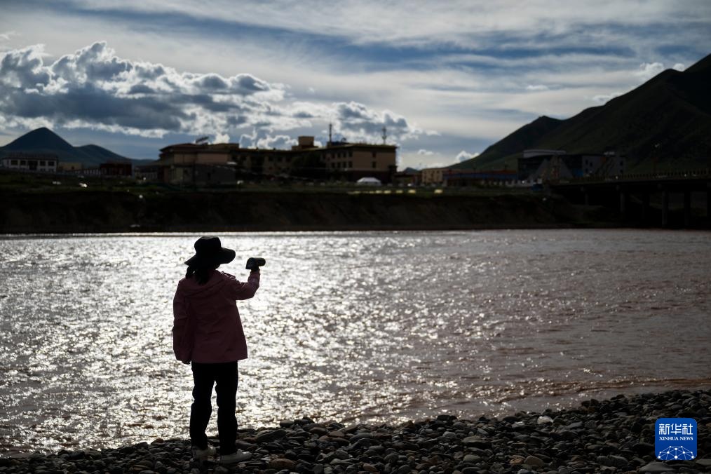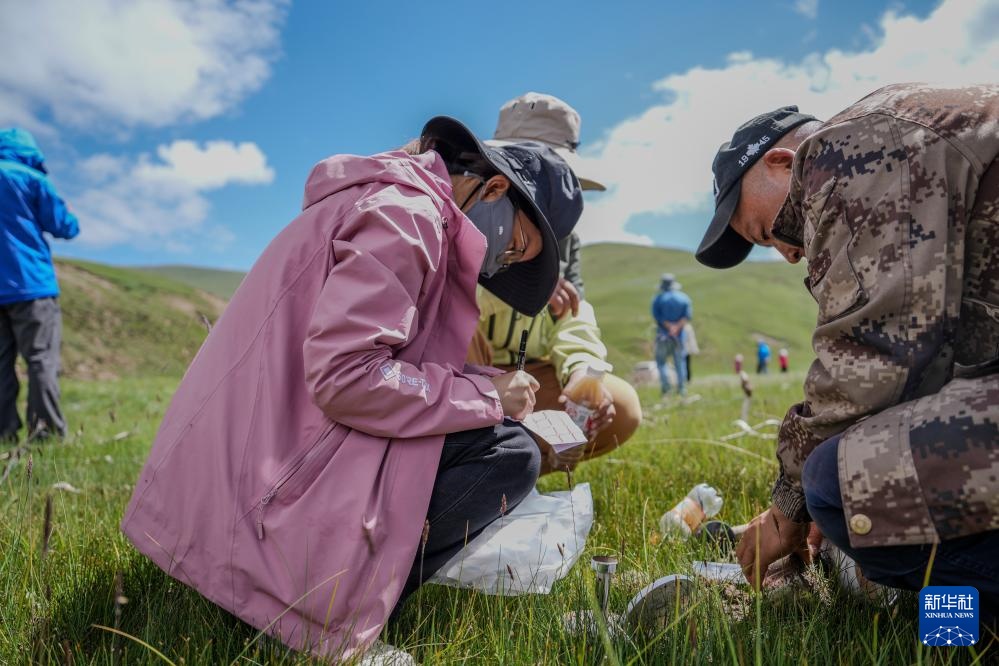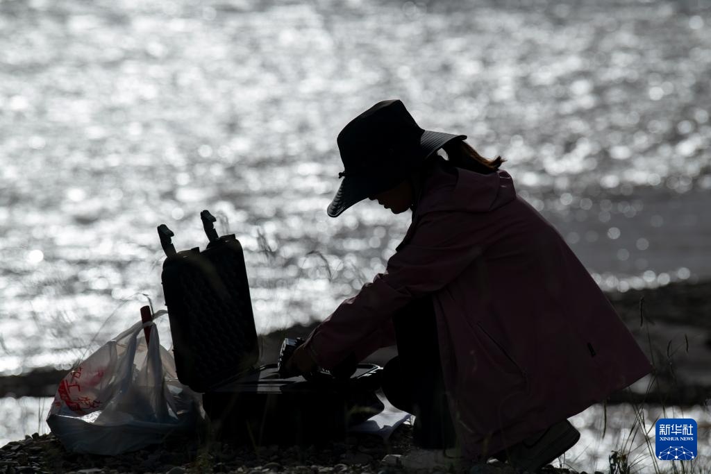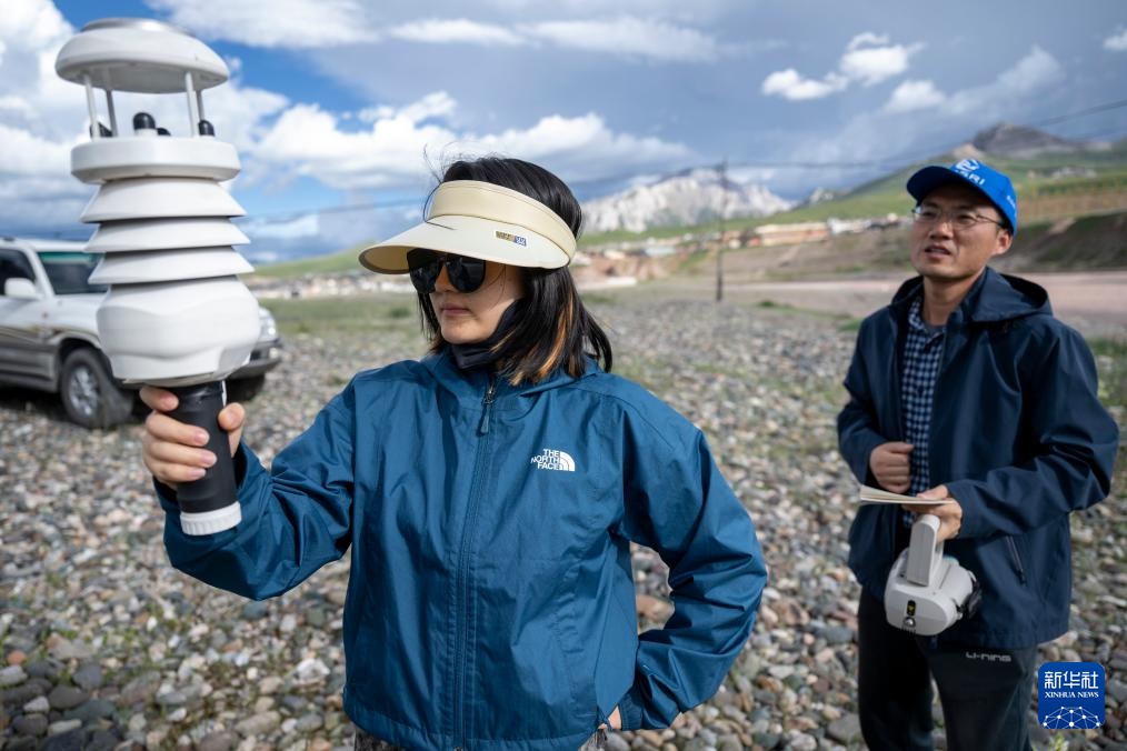 7月23日,长江科学院水资源综合管理研究所的程淑婕在通天河曲麻莱河段测量土壤温湿度。