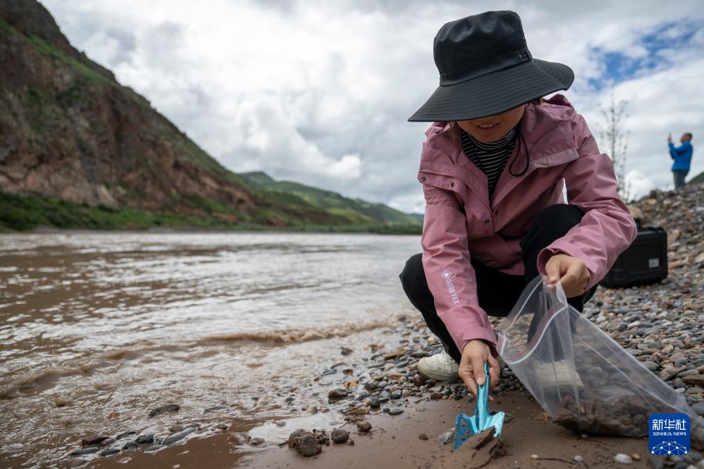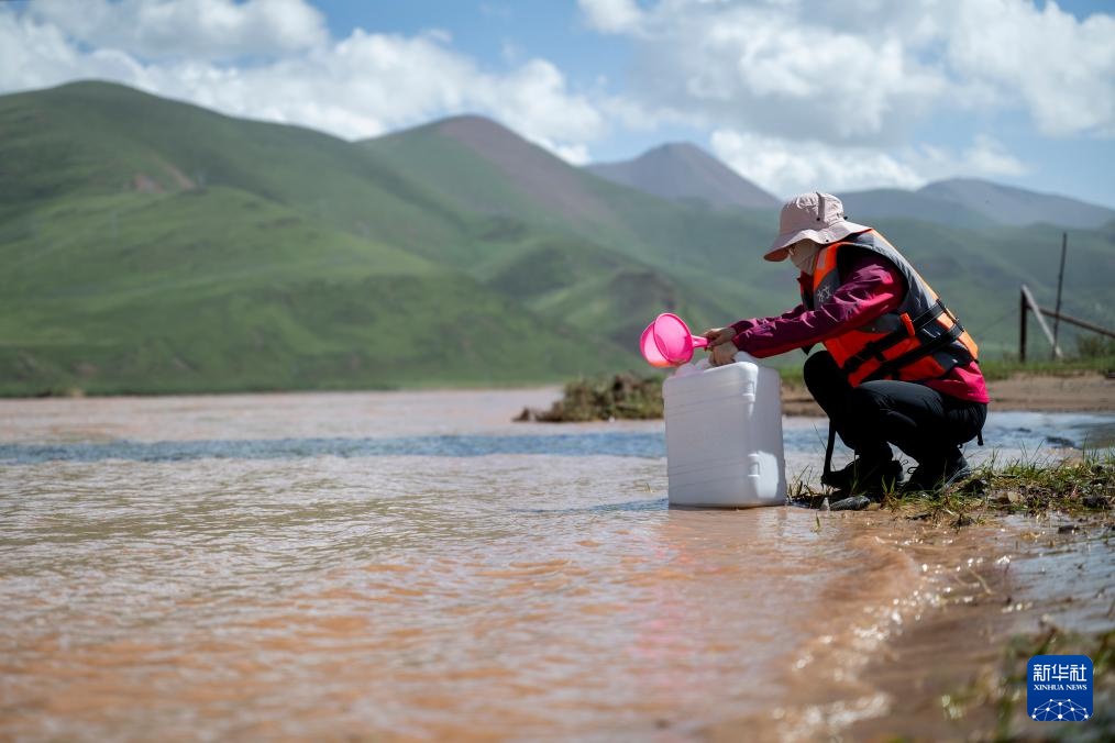 7月23日,青海省水文水资源测报中心的马蕊在聂洽曲进行水样采集工作。