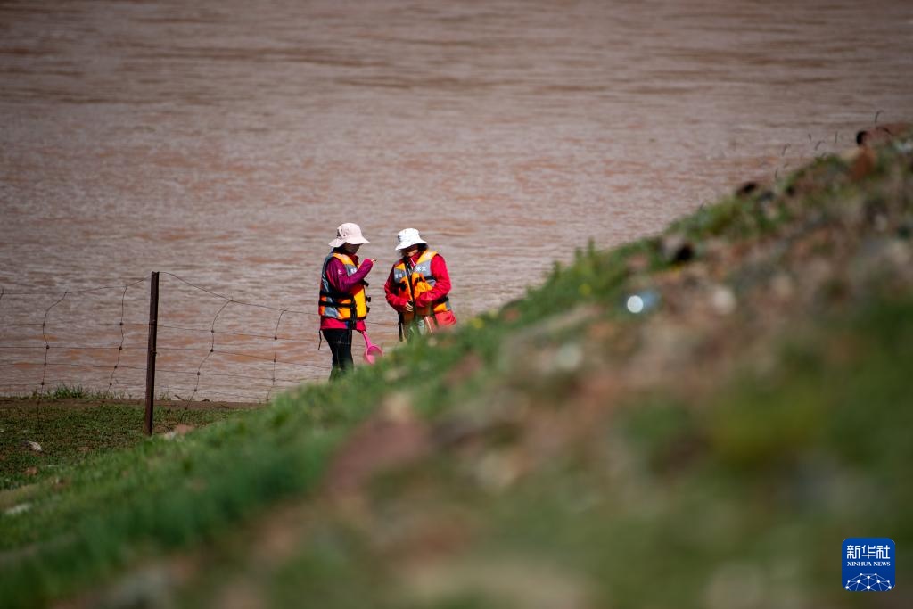 7月23日,在通天河曲麻莱河段,青海省水文水资源测报中心的马蕊(左)和时璐在进行水样采集工作。
