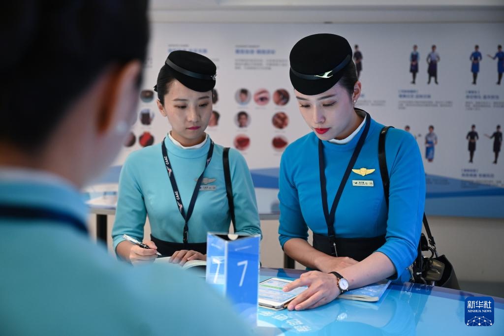 7月18日,陈于萱(右一)和同事在厦门航空乘务运行中心做航前准备工作。