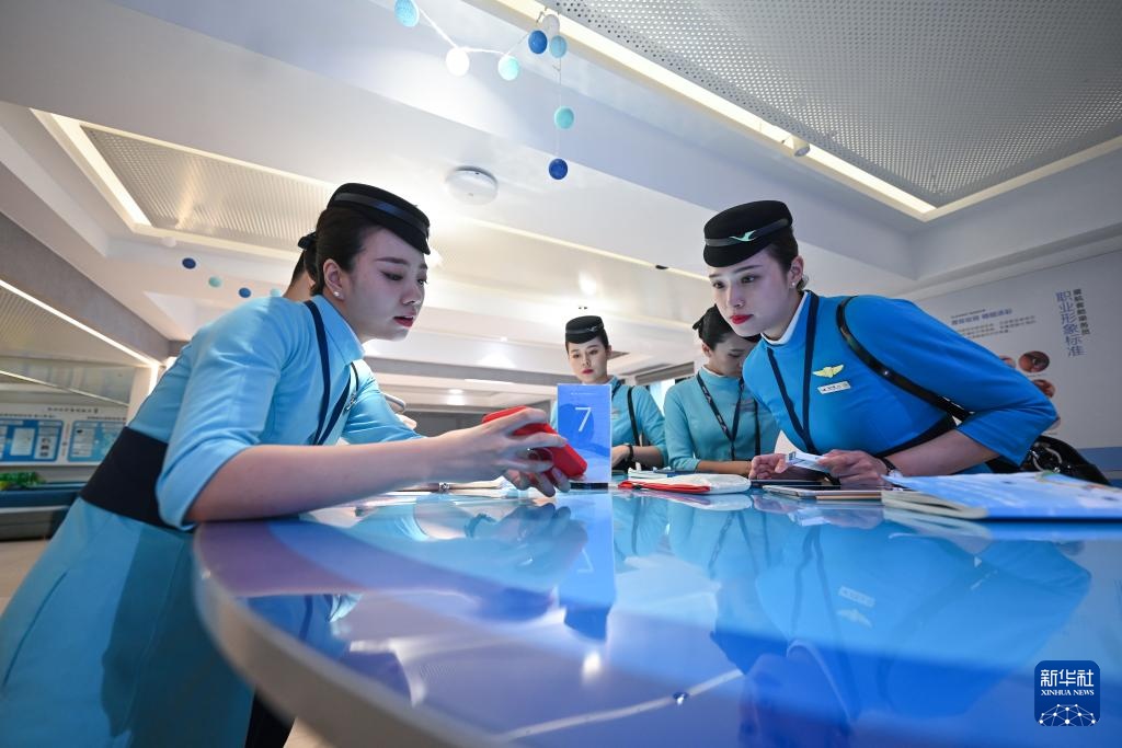 7月18日,陈于萱(左三)和同事在厦门航空乘务运行中心做航前准备工作。